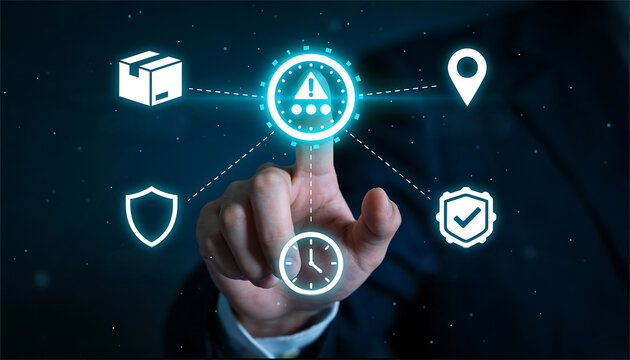 Businessman interacting with futuristic logistics interface for efficient delivery