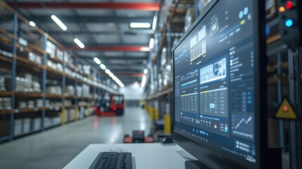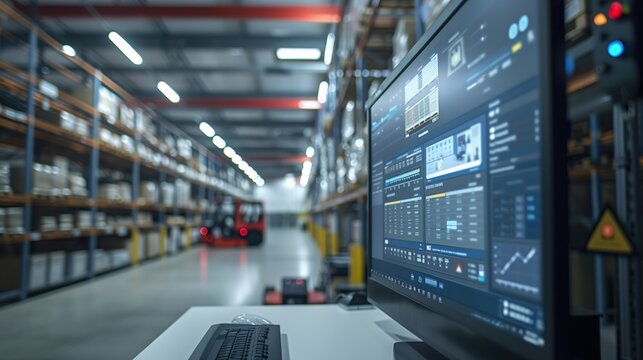 Warehouse Operations Monitoring via Software. Warehouse operations monitored by software displayed on a computer screen, showcasing real-time data and logistics management for efficiency.