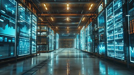 Smart warehouse environment, Futuristic storage facility with interactive digital overlays