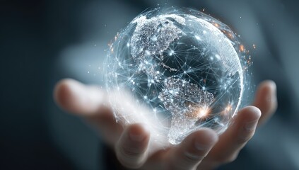 A futuristic hand holds a glowing, digital Earth, surrounded by abstract data streams and technology, symbolizing innovation and global connectivity.