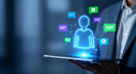 Glowing holographic virtual assistant icon above modern tablet illustrating interactive communication, digital messaging intelligence, and futuristic user experience technology
