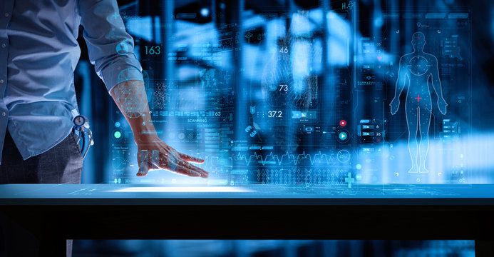 Medicine doctor and stethoscope in hand touching Ui and icon future of medical technology.