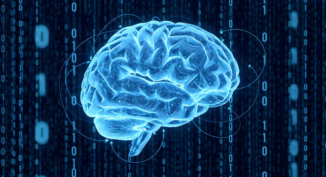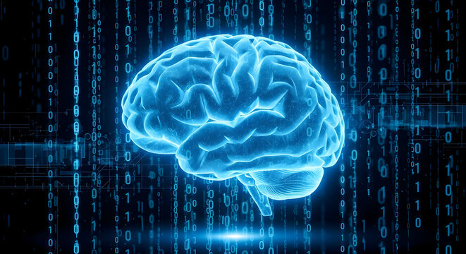 Neon Digital Brain Hologram Over Binary Cityscape — Artificial Intelligence Neural Network Visualization