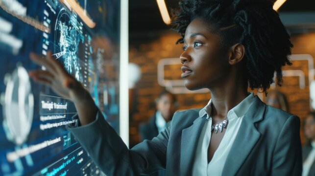 Futuristic digital screen displaying financial graphs and data analytics in a high-tech environment