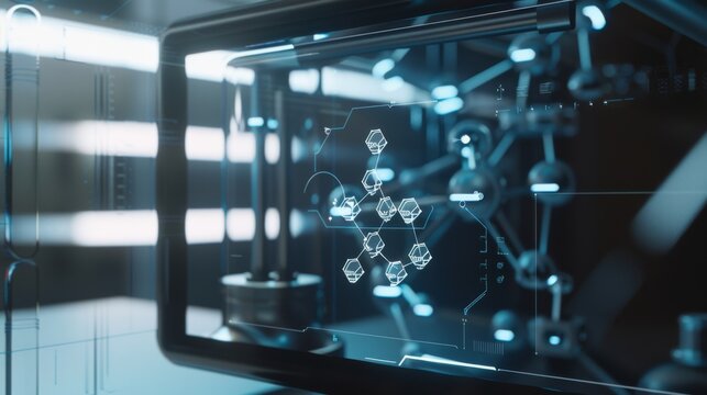Futuristic digital interface showcasing a molecular structure against a backdrop of luminous blue and black, embodying scientific innovation.