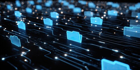 Futuristic cloud computing on glowing circuit board, data flow visualization in neon colors.