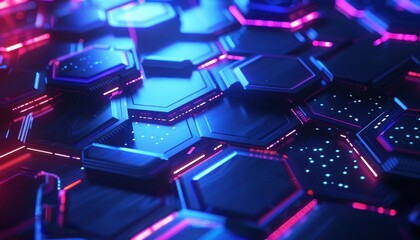 Abstract futuristic hexagonal pattern with glowing neon lights in blue and pink, showcasing modern technology and digital aesthetics.