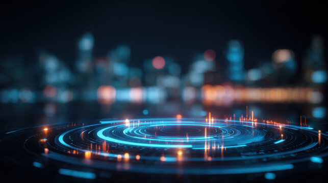 Futuristic digital interface with glowing circular patterns against blurred cityscape background