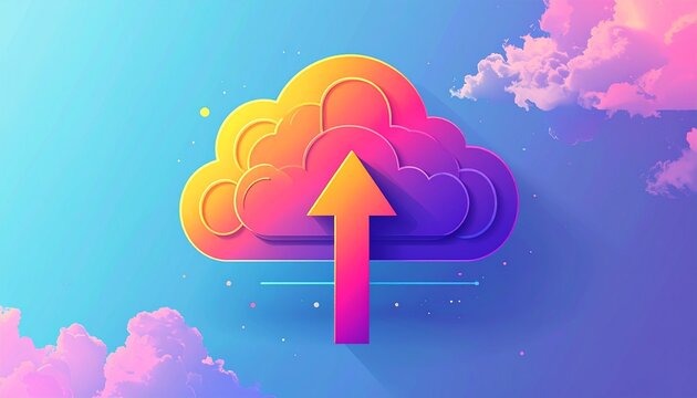 Vibrant cloud upload icon with an arrow, symbolizing data transfer, cloud computing, digital storage, and online services against a colorful sky.