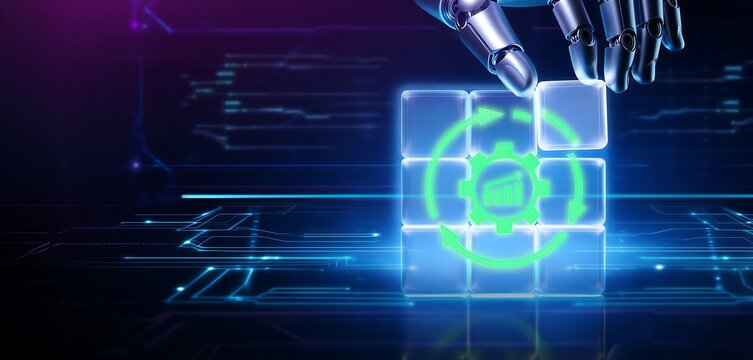A person interacts with a futuristic digital touchscreen, featuring a glowing interface with circuit patterns, cybersecurity icons, and data flow.