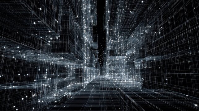 Digital cityscape at night, dotted with stars.  Abstract, futuristic, tech, network, grid