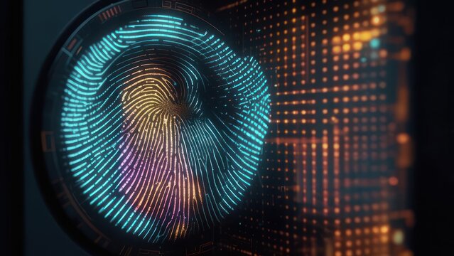 A digital fingerprint design with colorful, glowing patterns, symbolizing identity and security in a modern, abstract style.