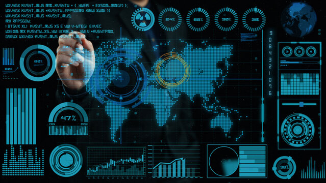 Modern digital interface for business analytics featuring world map, charts, and graphs, ideal for corporate decision-making and strategy development in a data-driven environment. Cipher