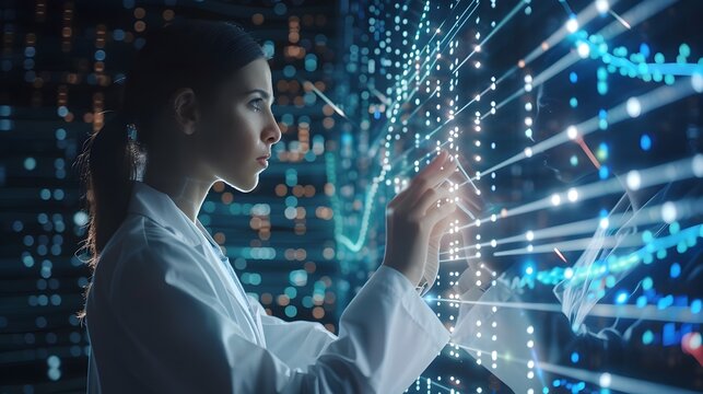 Female scientist analyzing data on a futuristic holographic interface in a lab. Cool lighting, focused atmosphere.