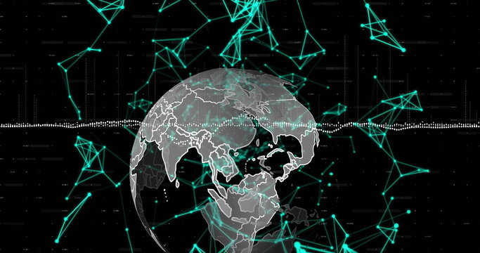 Data processing network illustrated on a globe representing global connectivity and information exchange, globe with data processing over network of connections on grey background