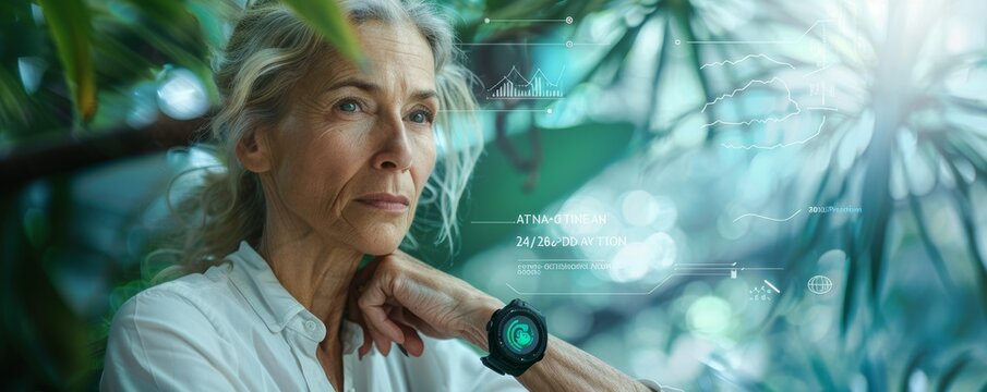 Modern mature woman with smart watch analyzing data in a nature setting