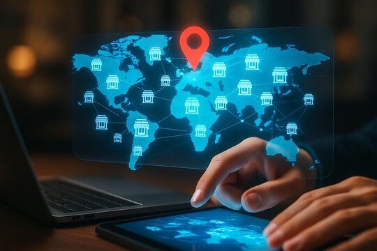 Futuristic digital map with glowing location pins, travel lines connecting cities, dark background with data overlays