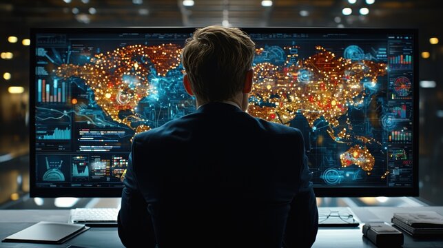 High-tech digital screen displaying global data maps and analytics with vibrant graphical elements.