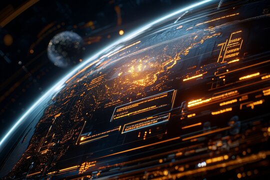 Futuristic digital interface showing data analytics and global maps, representing advanced technology and innovation in the modern world.