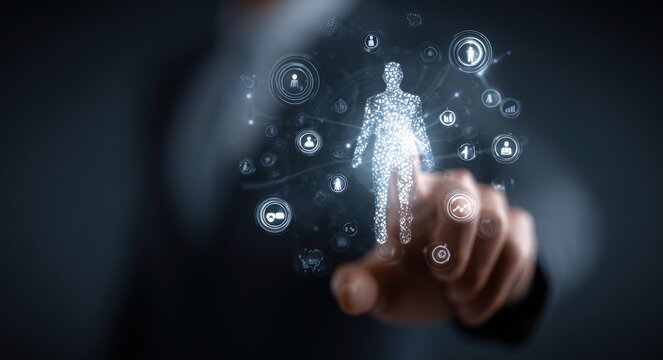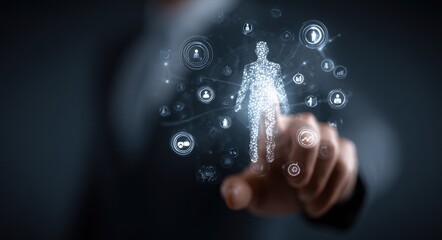 A businessman's hand hovers over a glowing lightbulb graphic overlaid on a futuristic interface of data icons