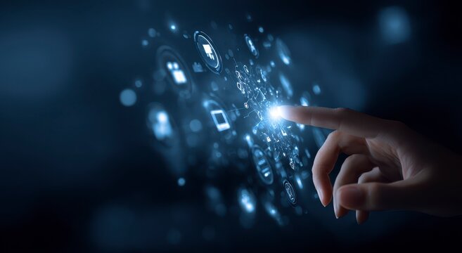 Businessperson interacts with a glowing smartphone overlayed with digital icons