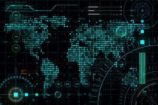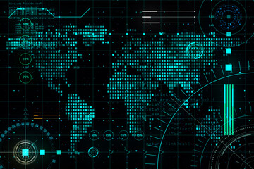 High-tech technology concept with digital abstract interface and glowing signs and world map at dark background. 3D rendering.
