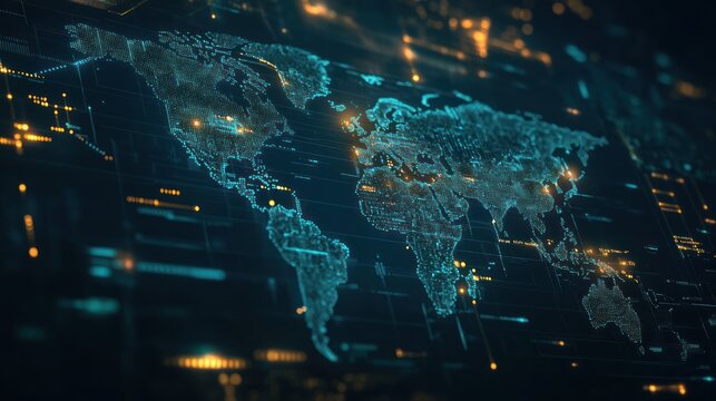 A digital world map with glowing blue and yellow dots and lines on a black background.