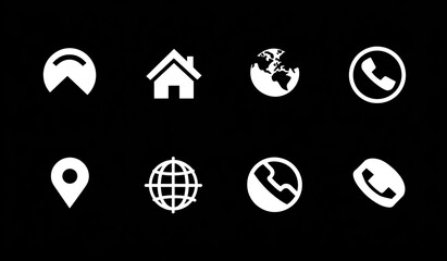Eight minimalist white icons on black background Wi-Fi, home, globe, phone, location, internet, phone, and phone