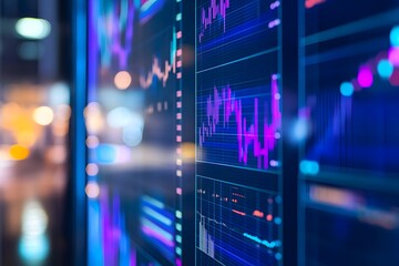 Digital display showing financial data charts and graphs with blue and purple hues.