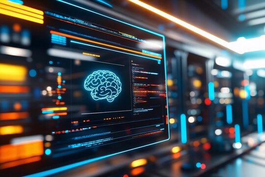 A sci-fi inspired AI interface displayed on a large digital screen with a blue brain icon and flowing data lines. In the background, a futuristic server room is highlighted.