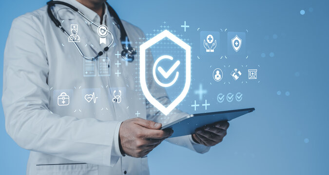 Doctor using digital tablet with health insurance hologram and medical icons on blue background representing modern healthcare technology concept.