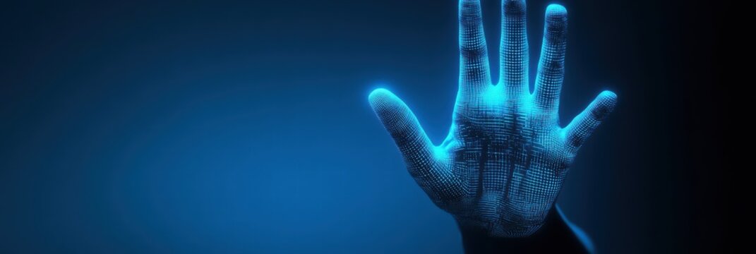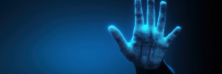 Silhouette of a hand with biometric scanning patterns against a blue background