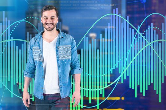 Smiling young programmer, graphs and code
