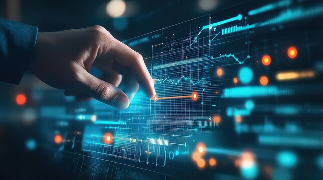 hand interacting with futuristic digital financial graphs and data visualizations with glowing blue and orange light effects on transparent digital interface, symbolizing technology and data analysis