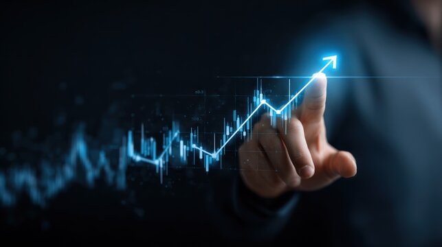Finger touching glowing blue upward trending financial graph data