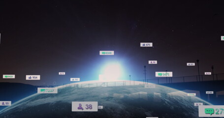 Composition of success world in cloud with digital icons over man typing on laptop keyboard