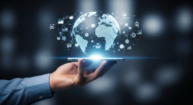 This image showcases a hand hovering over a globe connected by digital icons, representing advanced technology and global communication, symbolizing innovation and connectivity. Tessel