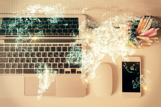 Social network hologram drawings over computer on the desktop background. Top view. Double exposure.