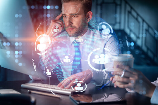 Attractive businesswoman in white shirt at workplace working with laptop to hire new employees for international business consulting. HR, social media hologram icons over office background