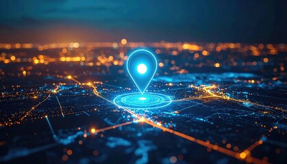 Digital location pin over illuminated cityscape at night.