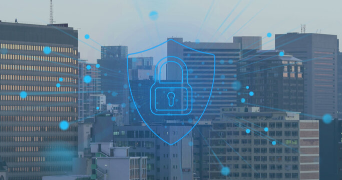 Image of network of connections with padlock icon over cityscape