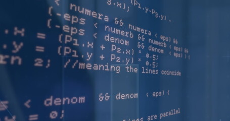 Image of numbers over interface with data processing against hexagonal shapes on blue background