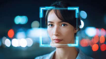 Futuristic facial recognition system scanning serious woman face. Artificial intelligence surveillance technology identifies person with biometric data in city at night