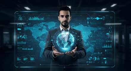 A businessman in a suit uses a digital interface with a glowing globe, symbolizing global business and technological advancement in a modern office.