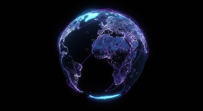 Global Network: A depiction of a complex global network, showcasing interconnected nodes and data streams across a stylized map of the world.