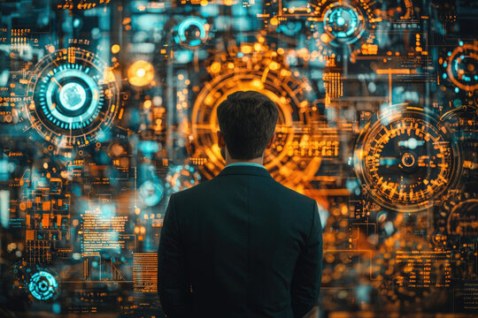 A businessman stands before a futuristic holographic display showcasing complex data streams and digital interfaces.