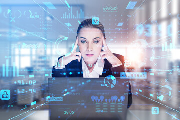 Businesswoman working with laptop, digital hud with digital market icons