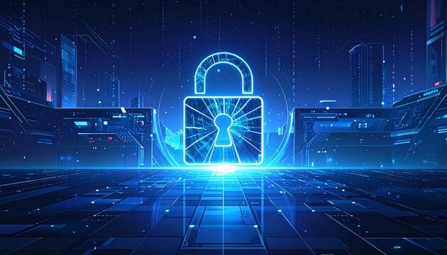 Glowing blue padlock in cyber-themed digital environment with circuit patterns and data center elements.
