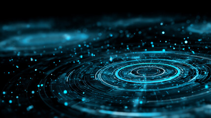 Abstract futuristic blue digital background with circular hologram elements and lines on a black background