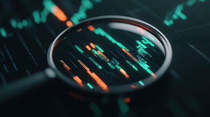 A close-up of a magnifying glass over a digital screen showing vibrant green and orange data patterns on a dark background.
